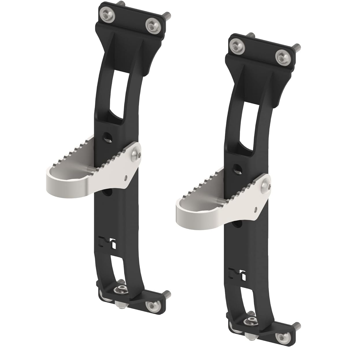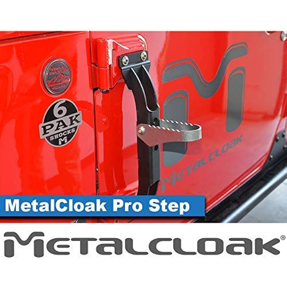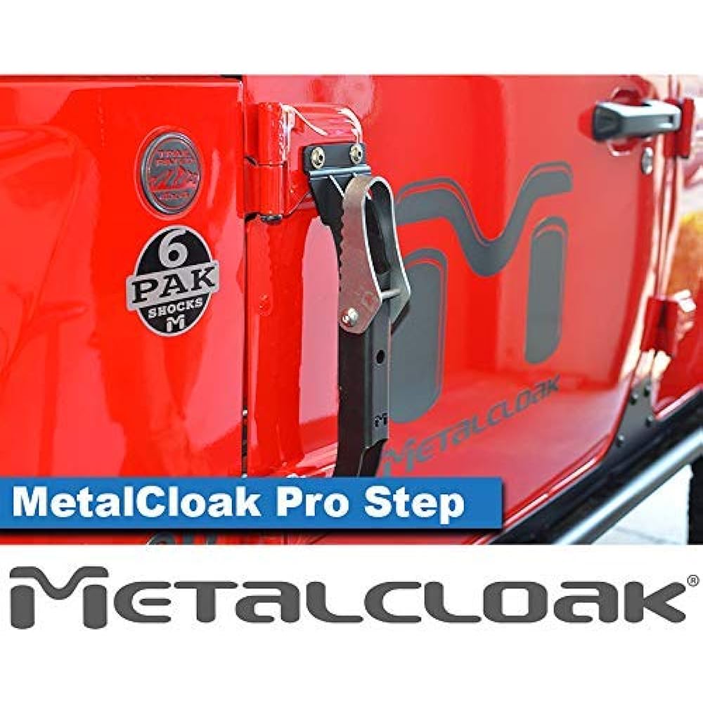 The MetalCloak Pro Step is a hinge mount flip down step for the JL or JK Jeep Wrangler and JT Gladiator Truck. A masterpiece of functionality and design, this step is built to last. MetalCloak Pro Step Features: 2-section adjustable mounting design. 10GA CAD molded steel construction. Textured Powder Coat Jeep Specific Mount Adapter Stainless Steel Flip Down Step. Flanged nylon pivot bushing Micro-pivot tension adjustment Fully welded stainless steel stop pin. Laser cut "M" logo 100% Made in the USA. The MetalCloak Pro Step is a flip-down attachment that provides safe and efficient access to your Jeep. CAD formed, 10GA, two section adjustable powder coated steel mounts make installation easy and ensure the door stays in place during installation. Only one side of the hinge needs to be installed, no "shims or washers" required. It's designed to fit perfectly. The mount adapter is specific for Jeep applications and fits over the factory hinge divots for secure mounting. 100% stainless steel steps will not rust even after repeated use. Flip-down steps pivot on stainless steel micro-tension adjustment, flanged nylon bushings for smooth rattle-free operation. Fully welded stainless steel stop pin eliminates rust buildup and is the strongest option for this application. Steps are 100% made in the USA and are your only choice if you're looking for the highest quality and functionality. [Click to reduce.]