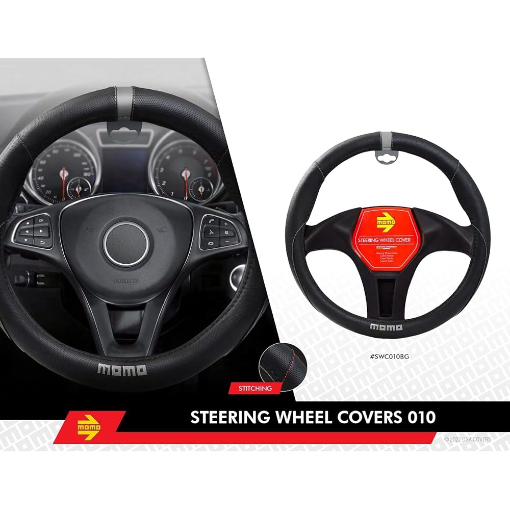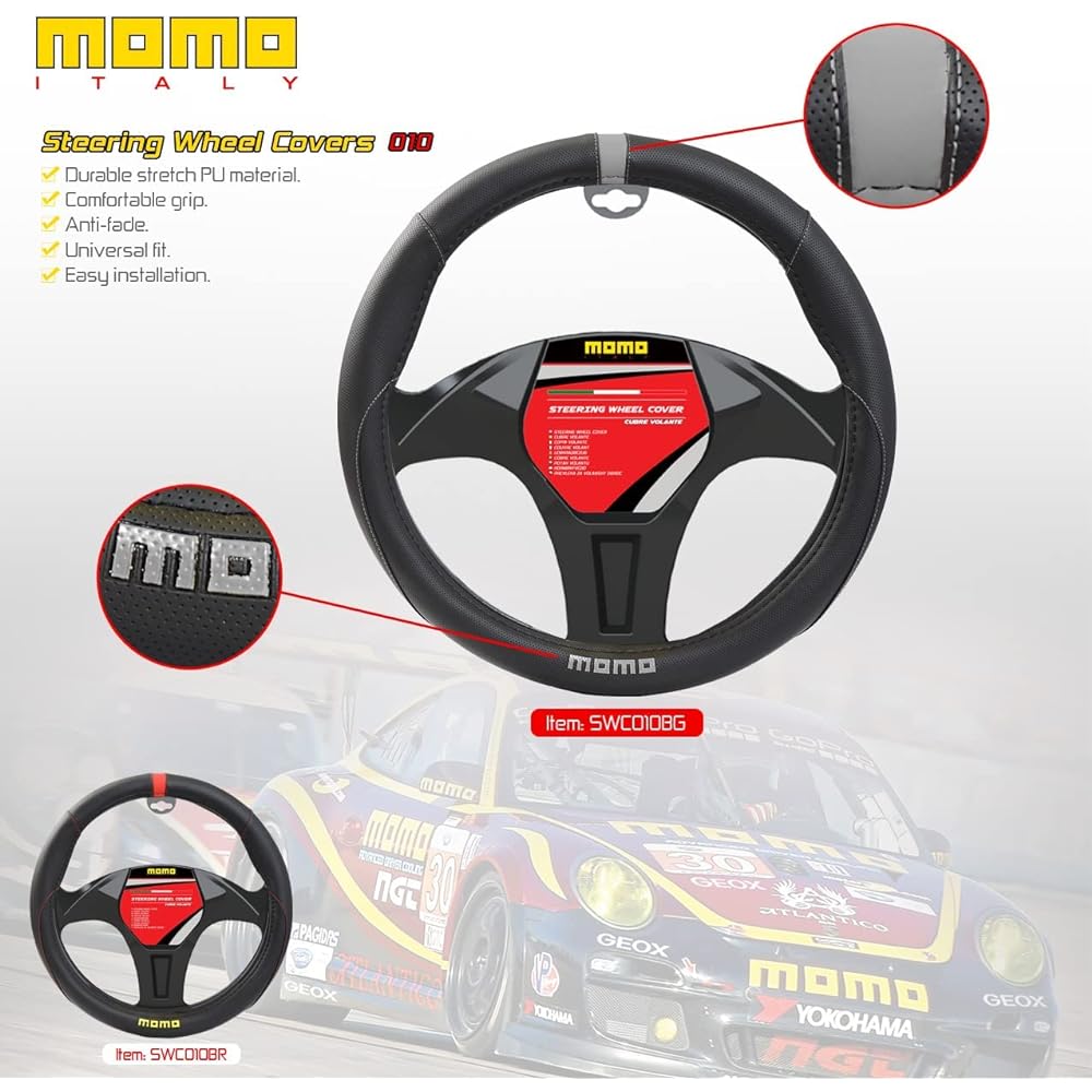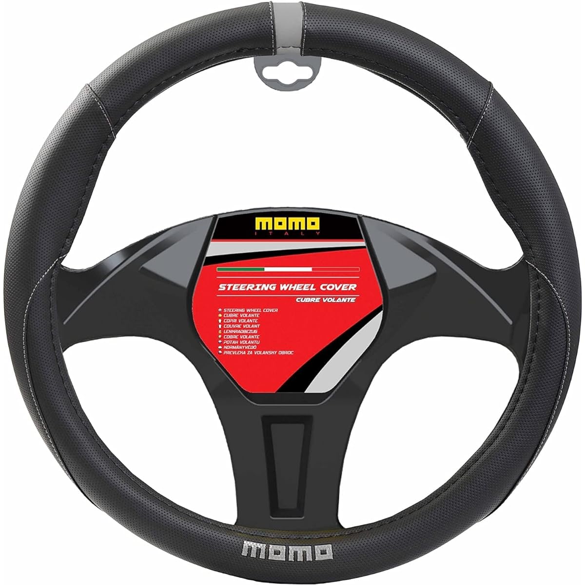 MOMO SWC010BG Car Steering Wheel Cover Features a striking Italian design, giving a sporty touch to your car's interior. Made of the highest grade soft-touch perforated polyurethane (PU) material to maintain durability, comfortable touch, and comfortable grip. Non-slip rubber lining prevents movement, improves vehicle control and contributes to a safer driving experience. A white PVC internal ring protects the original handle from color stains and long-term damage. Finished with a black grip, gray stitching and the iconic MOMO logo in the center position. Universal fit for quick and easy installation. Suitable for handles with a diameter of 14.5~15.5 inches.