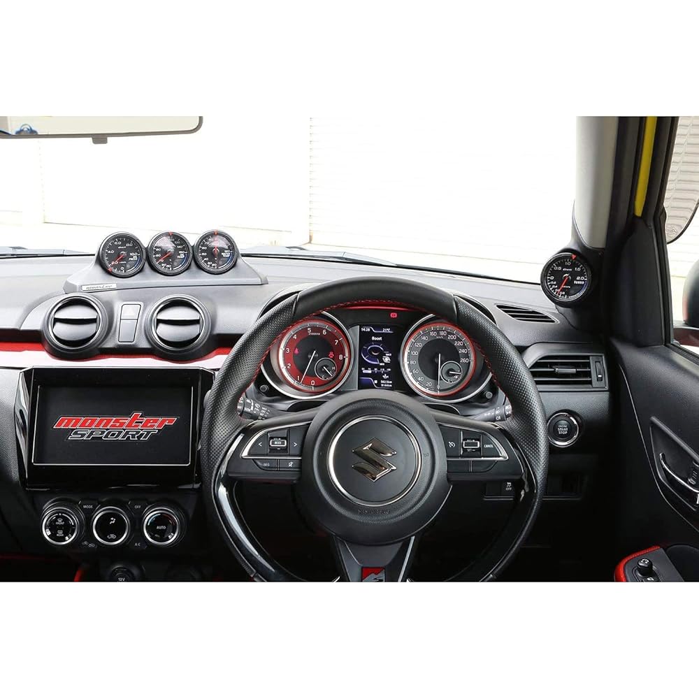 MONSTER SPORT meter mount concept. A meter hood that combines design and functionality. The meter is placed in a position and angle that is easy for the driver to see, and a unique layout embedded in the pillar ensures visibility. A smart meter hood designed exclusively for Swift Sport and Swift that balances visibility and sense of unity with the interior. ■Pillar-embedded layout By laying out the meter so that it fits inside the A-pillar, blind spots caused by the meter are minimized, while visibility is also ensured by avoiding sunlight. The meter mounting angle was also carefully considered, and the meter is mounted so that it is easily visible to the driver. ■Design A streamlined and sophisticated design that blends seamlessly into your interior. We also paid special attention to the form seen from outside the front window. φ60 specification for sports use with priority on instrument visibility. ■Surface treatment The matte black grain finish matches the texture of the dashboard and triple meter pod (853160-7600M). [Compatible models] Swift Sport [ZC33S] 17.09~ (1~2 types)/K14C Turbo/6MT/6AT*/FF Swift [ZC13S] 17.01~20.04 (1 type)/K10C Turbo/6AT/FF [ZC43S] 17.07~(1~2 types)/K12C NA+PB05A/5AGS/FF [ZC53S/ZD53S]17.01~(1~2 types)/K12C NA+PB05A/CVT/FF/4WD [ZC83S/ZD83S]17.07~(1 ~2 type)/K12C NA/5MT/CVT/FF/4WD *ZC33S-4 type has been confirmed to be compatible only with 6AT vehicles. Compatibility is currently being confirmed for Type 4 6MT vehicles. [Specifications] Material/polypropylene resin finish/matte black textured finish Compatible meter/60Φ electronic type (depth 40mm or less recommended) Product configuration ・Pillar meter hood body x 1 ・Plate tapping screw x 4 ・PAC primer ・Dedicated emblem plate x 1 ・Processing Template x 1 ・Instruction document x 1 Installation / Genuine pillar cover drilling, fixing with tapping screws and double-sided tape Standard installation time / 1.0 hours Notes on installation * As it is a resin product, installation time and usage environment (temperature, etc.) Since the fit of the meter may loosen, please use a separate harness tape etc. to secure the meter body on the back side of the hood. *The meter body is sold separately. *The depth from the mounting surface of the electronic meter that can be mounted is 40mm or less (equivalent to Defi Racer Gauge). [Notes] *In order to install this product, drilling of the pillar interior cover is required. *The meter body is sold separately. * The depth from the mounting surface of the electronic meter that can be installed is 40mm or less (The reference installation image is Nippon Seiki's Defi Racer Gauge). *It is not assumed that a mechanical meter will be installed. *As this is a resin product, the fit of the meter may loosen depending on the time of installation and usage environment (temperature, etc.), so please use a separate harness tape to secure the meter body on the back of the hood. *Specifications of this product may change or production may be discontinued without prior notice.