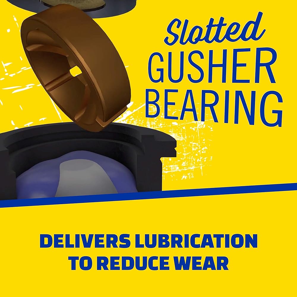 Problem Solved Gusher Bearings - Metal-to-metal design provides high strength and allows grease to flow to the bearing surface, reducing friction and ensuring long life. STRONG AND DURABLE - Ball studs are heat treated to meet or exceed OE requirements to prevent premature failure and improve fatigue strength. Greasable Sockets - New lubricants allow contaminants to flow away, reducing corrosion and wear. Keeps out dirt and water - A pre-installed dust boot protects socket components from wear-causing contaminants. Absorbs Shock - Belleville preload washers securely hold bearing packages in place during bearing wear. Easy to install - Precise tolerances make installation and steering alignment easy, ensuring a perfect fit right out of the box. Full Coverage - Compatible with foreign and domestic nameplates.