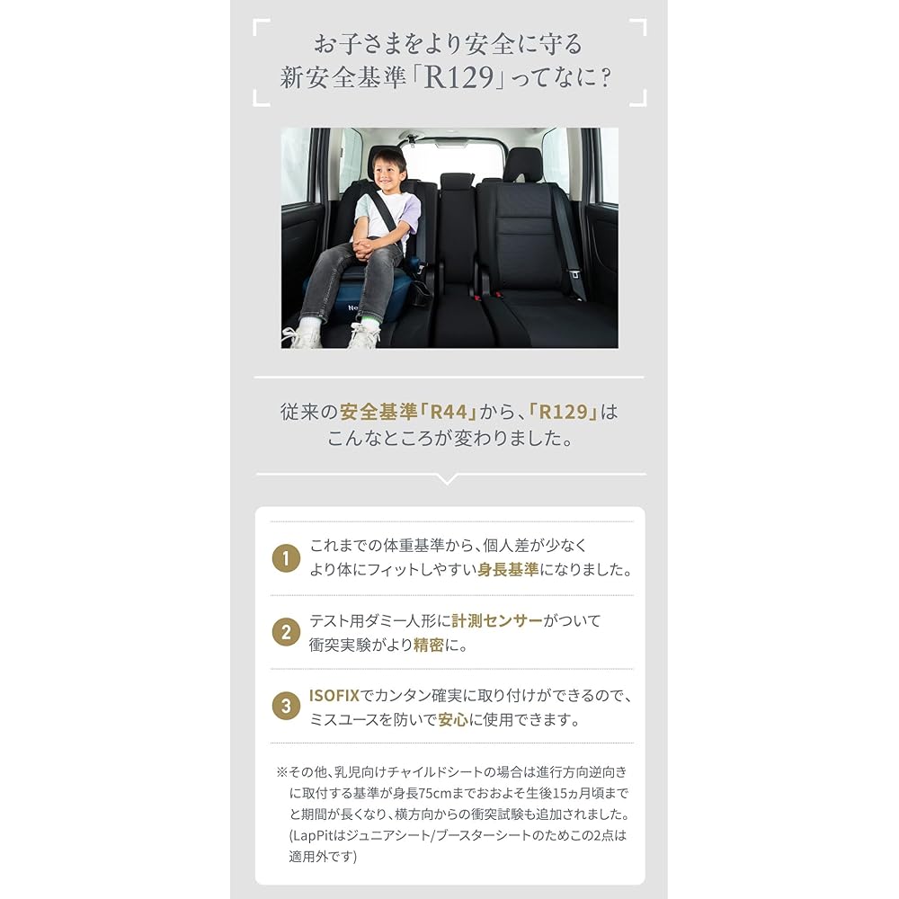 R129 I-size compatible, height standard 125-150cm ISOFIX + 3-point seat belt fixed (OK without ISOFIX) Lightweight and easy to install. There are two height levels that you can simply fold down the backrest, so there's no need for a belt guide.The seat has 2cm of low-resilience cushion foam for a soft sitting experience. The isofix release tab has a function to prevent accidental operation.Cup holders can be attached to the left and right sides.Hand washable.