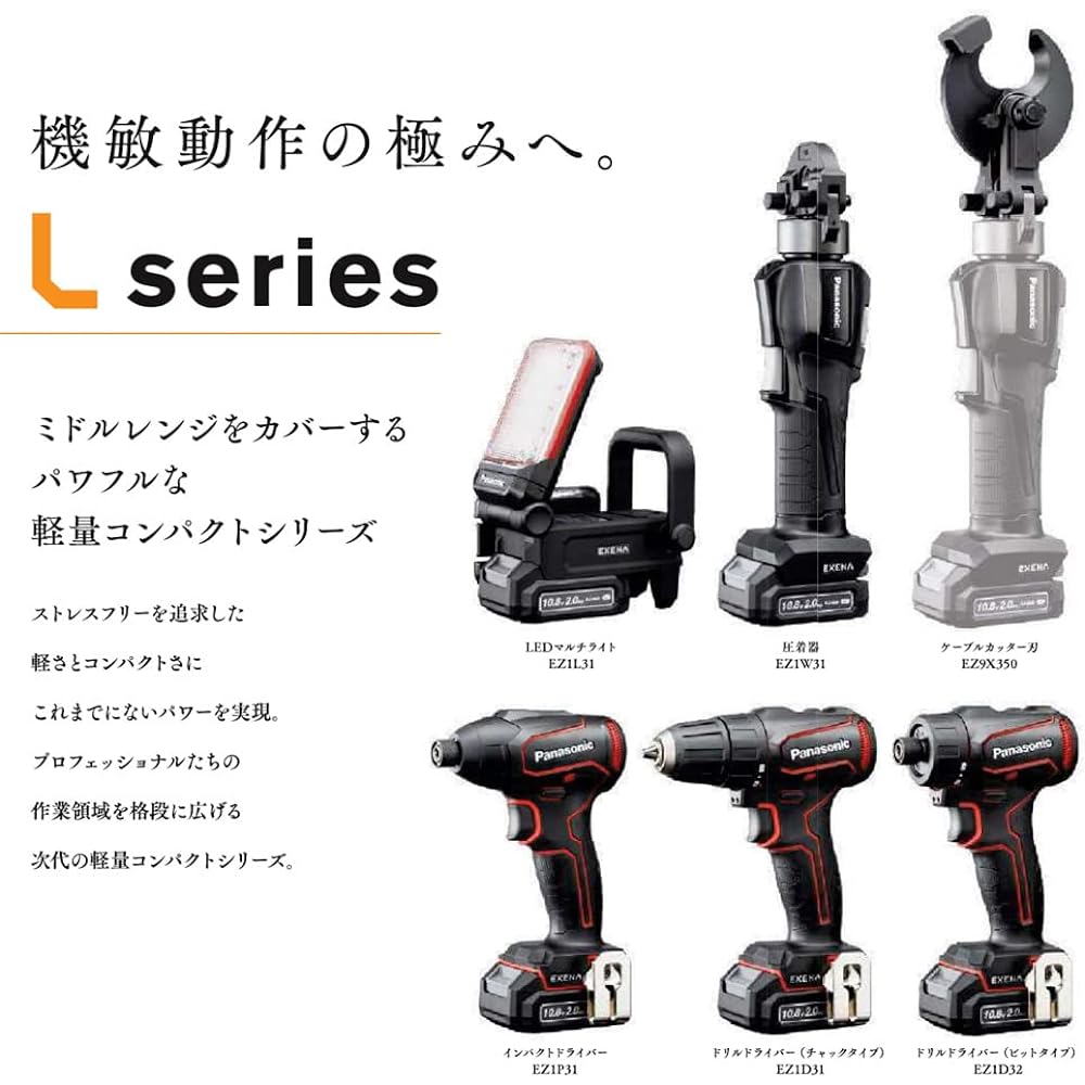 ●The next-generation compact series "L Series" expands the scope of work for professionals. ●A rechargeable impact driver that is lightweight and compact yet delivers high power of 165Nm. ●Lightness of 1.01kg makes light work comfortable. ●High power makes bolt tightening and removal easy. ●One unit covers a wide range of tasks, such as installing air conditioner ducts on exterior walls and installing bases for LED lighting equipment. ●10.8V covers 90% of wood screw tightening work. ●Lightweight, compact, powerful and wide working area. ●Reduces fatigue when working upwards, such as installing equipment and maintaining equipment. ●Equipped with electronic speed control function, forward/reverse switching function, and brake function. ●Equipped with LED lights at the top and bottom points to prevent shadows from forming, making it comfortable to work in dark places. ●Compact, lightweight, and easy-to-use set with two 10.8V 2.0Ah batteries. ●Comes with a plastic case for convenient carrying and storage.