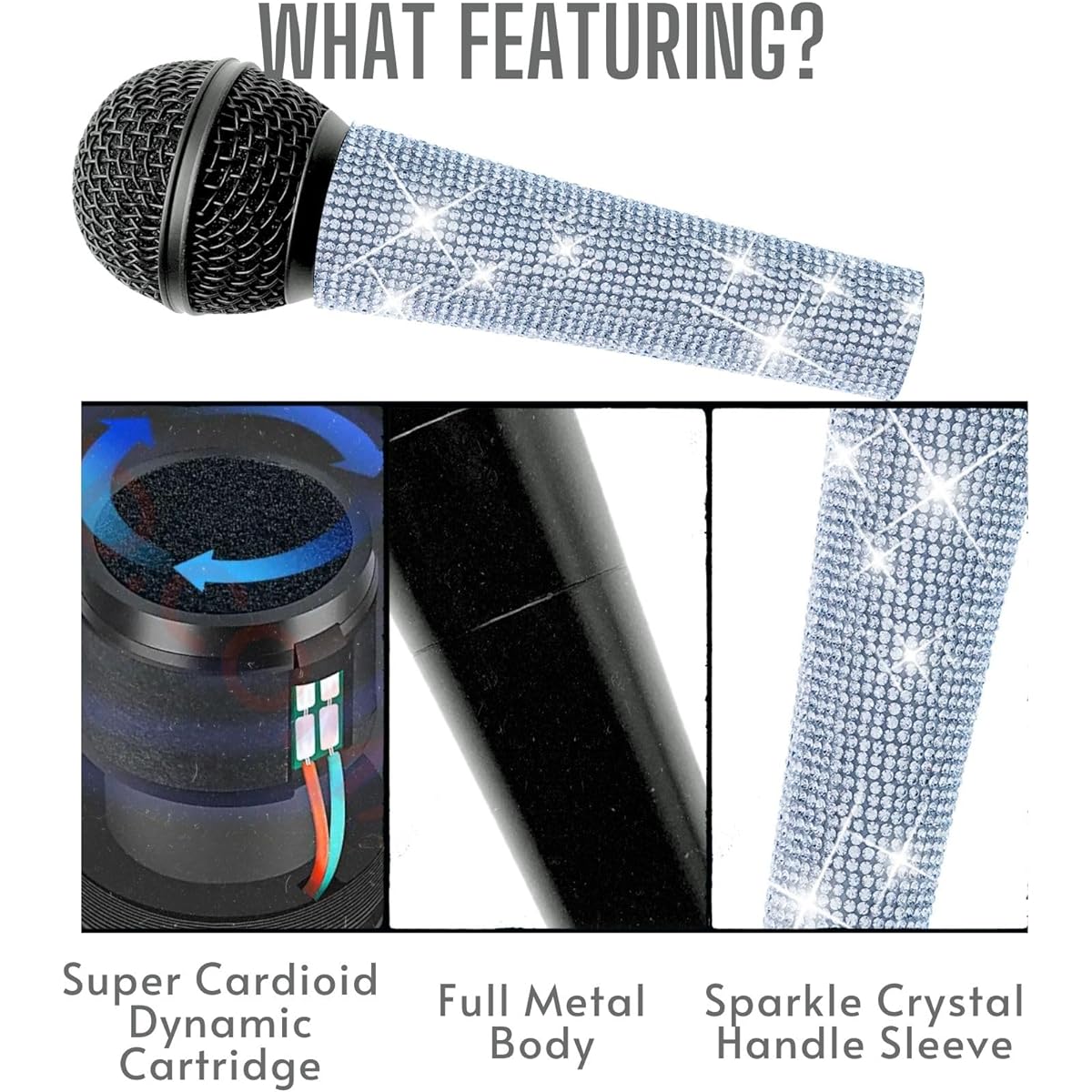 Die-cast Cardioid Dynamic Vocal Microphone: Professional Cardioid Wired Microphone Handheld High quality level materials and components, die-cast zinc handle body, brass coil core, unidirectional pickup pattern set for maximum gain. Performs industry standard superior voice and filters to avoid unwanted background hiss and "pop" noise. FINE BASS COIL CARTRIDGE: 58 series microphone karaoke kit with glorious premium range bass in key voice core. Perfect control of proximity effect and customized frequency response, specially formed for vocal performance on stage. Sparkly Pink Microphone Cover Set Compatible: Silver rhinestone crystal handle sleeve and silver decorative headband set make the dynamic microphone stand out in your stage performance. As a cute part, the pink cover set is also highly compatible for Shure microphone sm58lc, beta 58a, pga48lc, pga58, sm58s, beta58 58a audio-technica, samson, basic dynamic vocal replacement use. USE ANYWHERE: XLR microphone singing machine is widely used in outdoor and indoor. For singers, DJ speakers, producers, streamers, studio recording engineers, podcasters, voiceover, ktv, dance ball, conference room, news interview, stage show, home karaoke, microphone props in friends party karaoke, karaoke for adults and kids (not a toy microphone). XLR CABLE TO 6.35MM JACK: 3.5M (11.5FT) brass core cord audio cable, 6.35mm jack to XLR connector with silver plating, eliminate noise and ensure the stability and consistency of voice transmission. It will not disconnect or interrupt during playing.