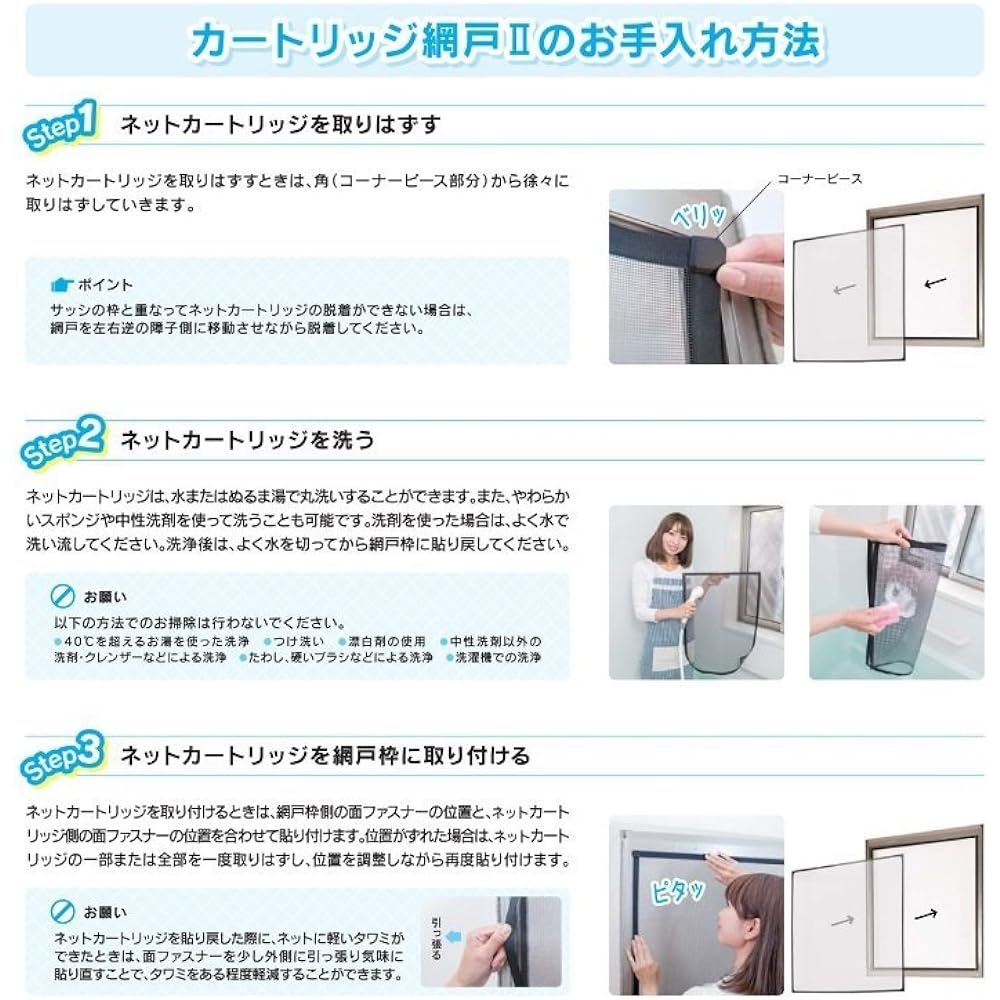 You can remove the net from inside the room and wash it without worrying about it falling. The frame is soft so you can wash it in the bathroom. Even if the net is torn, it can be easily replaced by simply removing it and replacing it with a new cartridge. Replacement screen doors are also available. Two color variations are available.