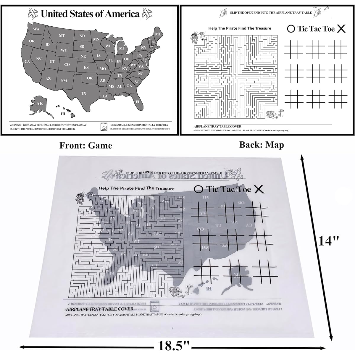 A must-have travel accessory: Measures 18" wide x 14" long and is made from 20% recycled plastic. Fits any economy airplane, train, bus, or road trip tray table. KIDS TRAVEL TRAY COVER: Our table cover not only keeps your tray table clean, but also can be used to play TIC TAC TOE, Find the Word, Maze games, and US Maps. Easy to use: Open the top opening and follow the arrows on the table cover to slide it onto your dining table. After use, it can be used as a garbage bag. Pack of 12: This children's table cover is easy to carry. Each disposable tray table cover is individually wrapped. SAFE FOR TRAVEL: Let your family touch the dining table with more peace of mind and ensure travel safety.