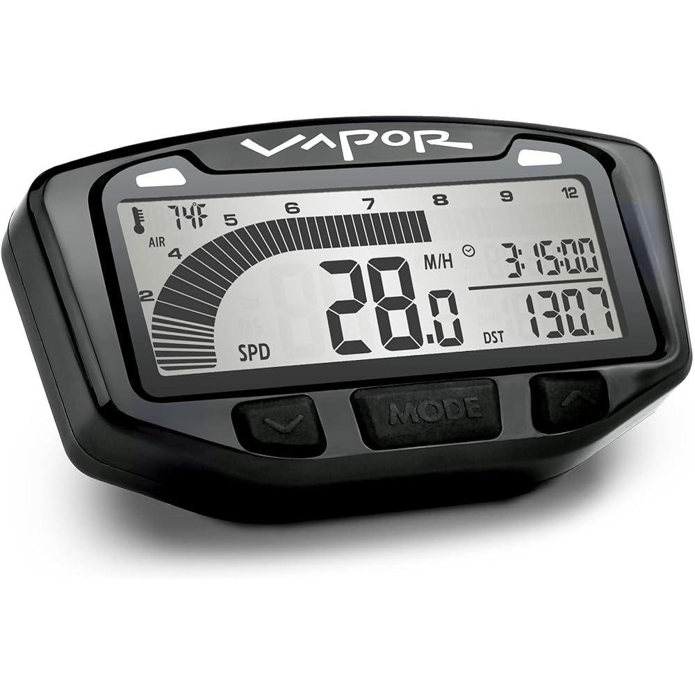 Features a large RPM graph and speed readout. Programmable LED light that flashes when shifting gears or during overheating events. Vapor displays speed, teach, engine temperature, ambient temperature, resettable distance, clock, trip time, and odometer. Customize and fine-tune Vapor to tire size, teach sensitivity, trigger temperature, and teach warning lights. Vapor operates on regulated AC or 12V DC electrical systems. That means it works with almost everything. Use the built-in stopwatch for race training or the resettable mileage to endure the course.
